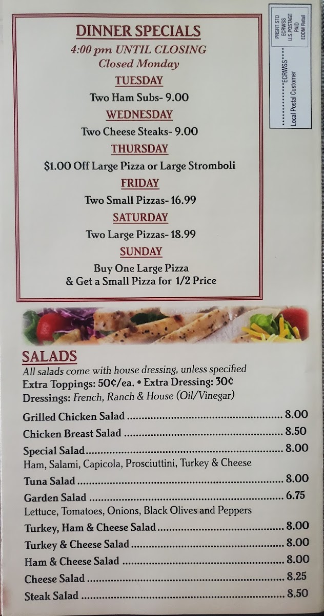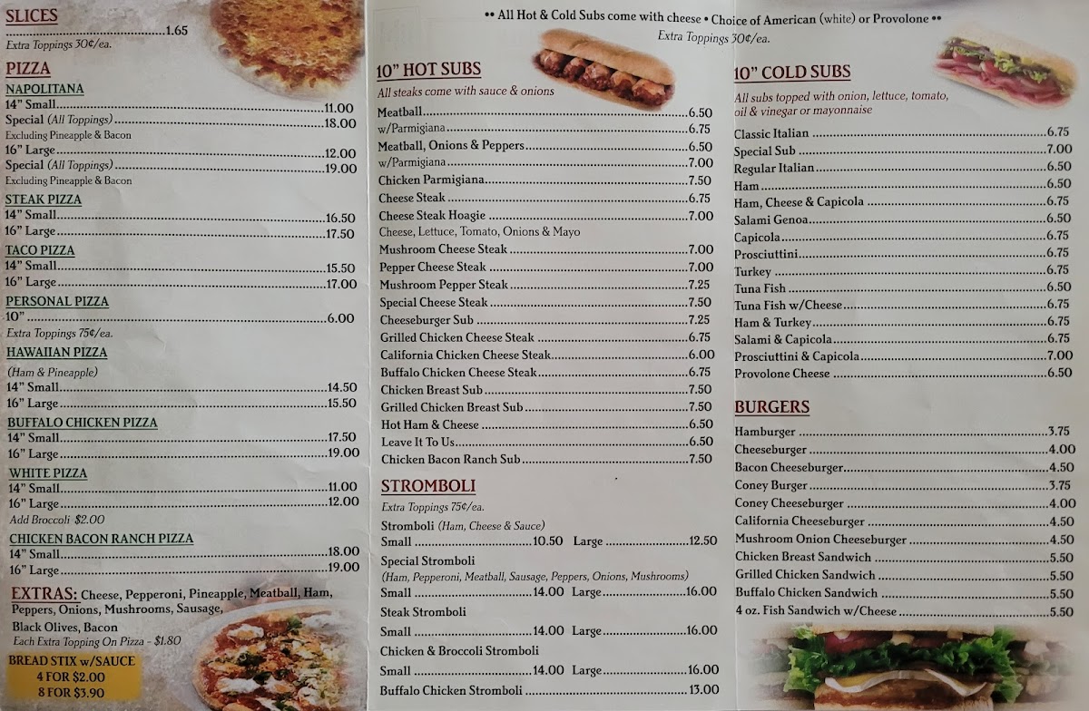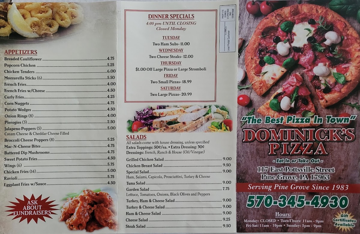 Looking for a place that serves mouthwatering pizza and delicious comfort food? Look no further than Dominick's Pizzeria Menu. Located at 117 E Pottsville St in Pine Grove, PA, this cozy spot offers a wide range of flavorful pizzas, from classic margherita to hearty meat lovers’ options. Every dish is crafted with fresh ingredients and a whole lot of love, making it easy to find your new favorite slice.